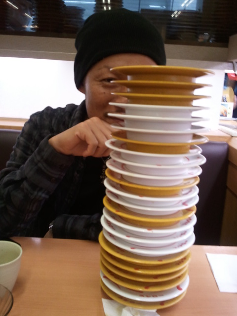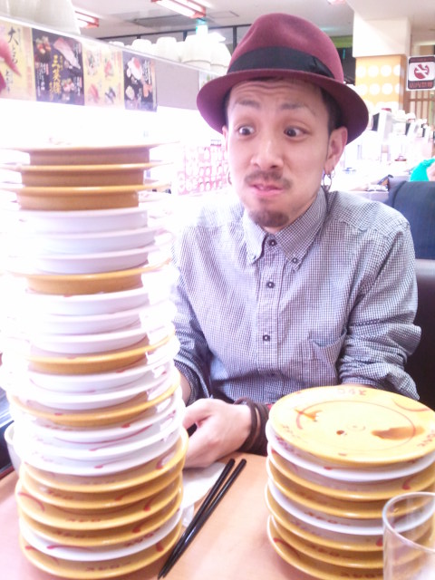 顔を隠すほどの「皿タワー」